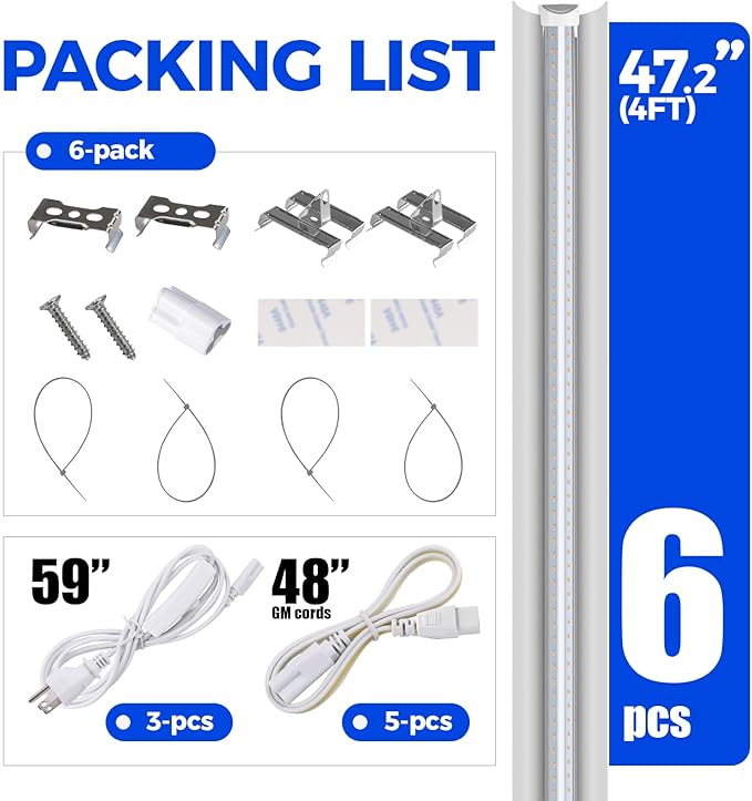 - What You Get: 6 x Barrina LED Grow lights, 3 x Power cords with ON/OFF switch, 5 x Connecting Cords(48''), 6 x Small Connectors, 12 x Tapes, 24 x Installation Clips, 24 x cable ties