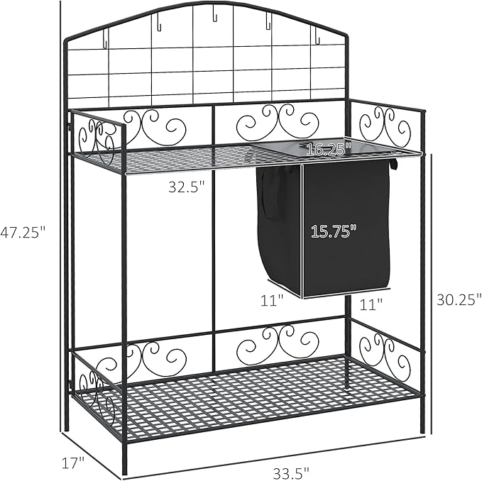 - Flourish Motif Steel Potting Table Info: Overall Dimensions: Max Load: 66 lbs. (Tabletop), 44 lbs. (Bottom Shelf), 4 lbs. (Hook), 4 lbs. (Bag). Overall Dimensions: 33.5" L x 17" W x 47.25" H. Tabletop Dimensions: 32.5" W x 16.25" D. Assembly required