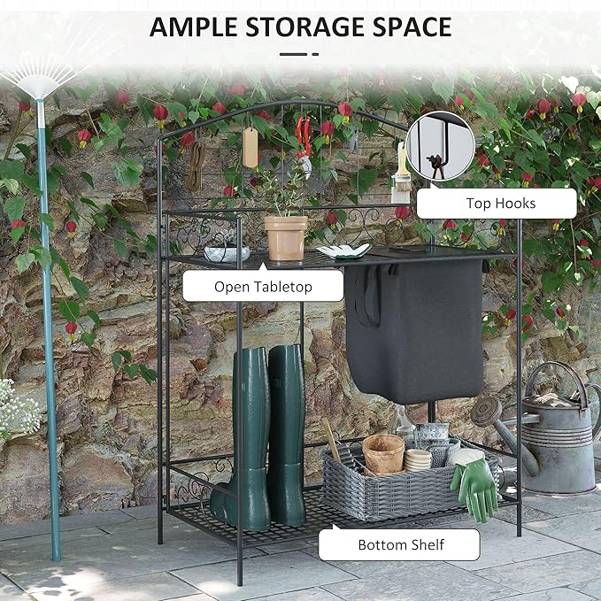 Outsunny Folding Potting Bench Table, Metal Garden Workstation, Work Bench with Large Build-in Bag with Cover, 5 Hanging Hooks & Storage Shelf, Flourishes