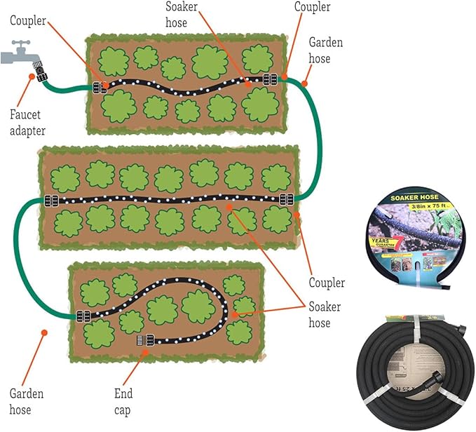 - Perfect Delivery of Water - Save up to 70% water. Evenly waters from beginning to end slowly, steady release at the soil line. This ensures that water is not wasted. The slow release allows the soil around plant roots to gradually absorb the water. And the proximity of the hose to soil means that very little if any is lost to evaporation.Liquid fertilizer can be used to distribute nutrients to planting through the soaker hose.