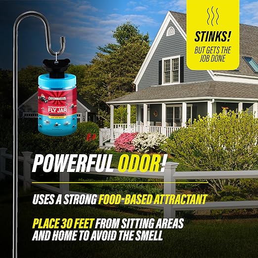 - SAFE AND NON TOXIC: Our innovative non-toxic fly lure is a safe home defense pest control option to use around pets and children. This powerful food based lure attractant has a scent that flies will love (that’s the point) but isn’t ideal inside a house. Keep it outdoors, hang it from a tree, use it for a stable fly trap, or anywhere else flies belong! The Fly Jar can be placed on the ground or hung a few feet off the ground.