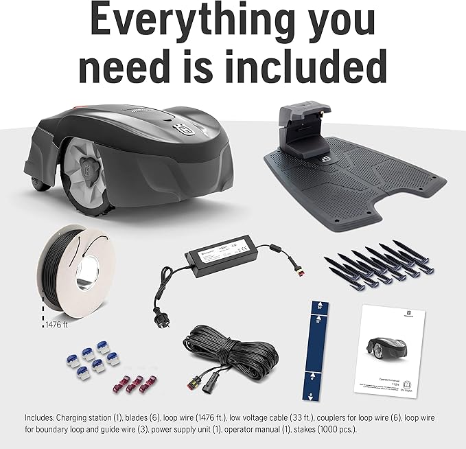 - DIY Installation: Set up your Husqvarna robot mower with the self-installation kit (included); place the charging station, bury or lay the boundary wire around the perimeter of your yard, install the guide wire, choose your settings, and start mowing