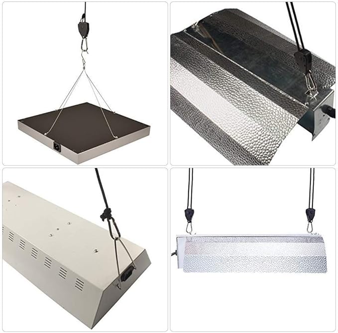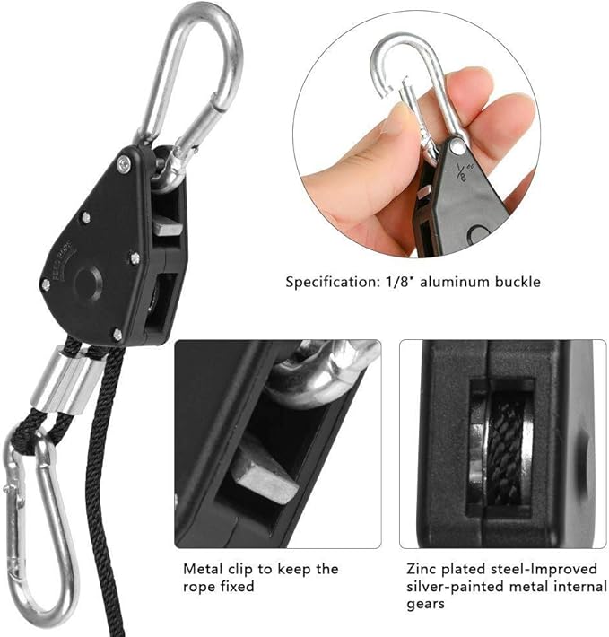 - 6 Pairs of 1/8" heavy duty grow light ratchet hangers.16pcs Carabiner Clip - Easy & quick auto. Locking, loose-proof design to ensure safety.