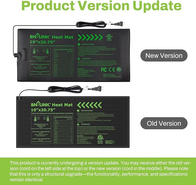 - ✓ RUGGED CONSTRUCTION: The cord for the temperature probe and grounded 3-prong plug measure an extended 6 feet in length, designed to suit almost any application you can imagine. This 10" x 20.75" mat is perfectly sized for standard 1020 trays. Each unit comes with BN-LINK’s strong 15-month warranty.Please note: This heat mat is being upgraded. You may receive either the old version (wire in the top-left) or the new version (cord in the center). Functionality and performance remain the same.
