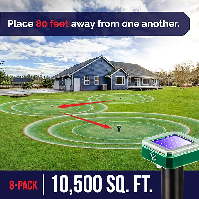 - Up to 10,500 Feet of Protection: Sonic pest repeller outdoor range extends far to deter burrowing pests that infest your yard; these sonic pest repellent spikes use pulses and vibrations to chase pests away (no more burrowing pests in 2-3 weeks after successful installation)