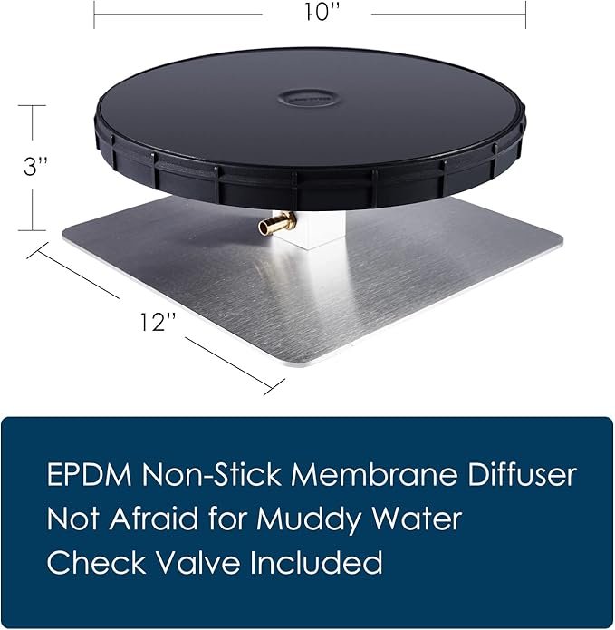 - EPDM non-stick 10” membrane diffuser. 12” square stainless steel base for the diffuser’s stability.