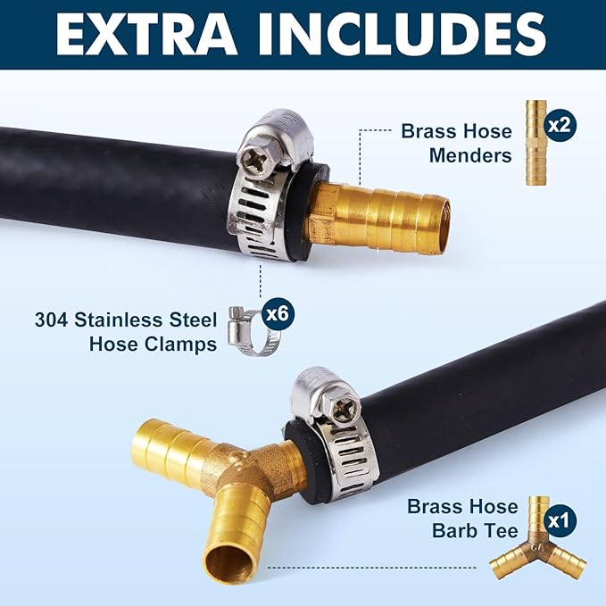 - 100ft, 5/16" ID, 5/8" OD self-sink rubber air hose One roll. 10 hose clamps, 1 tee brass barb fitting, 2 straight barb fittings included.