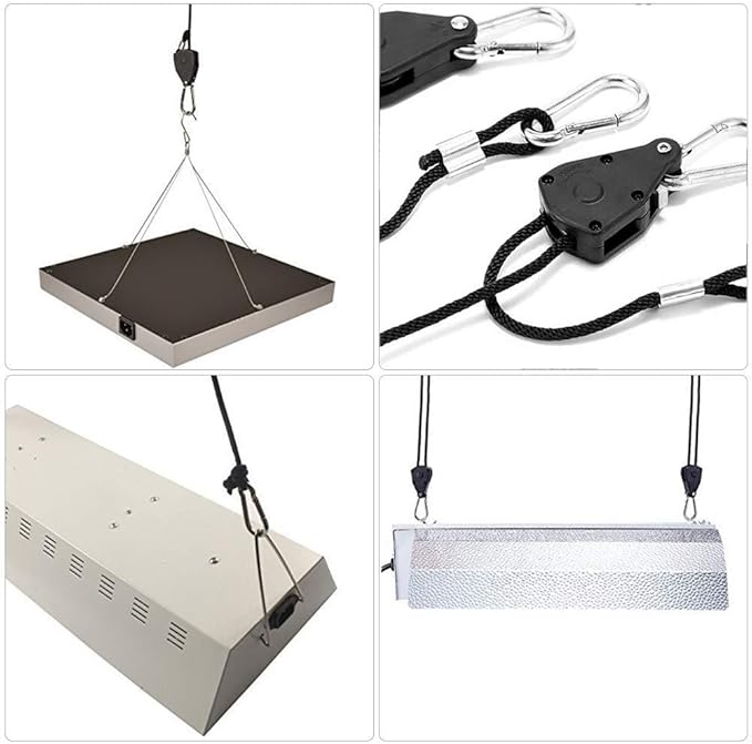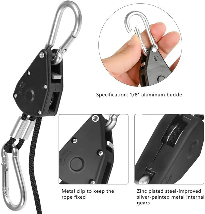 - 4 Pairs of 1/8" heavy duty grow light rope ratchet hangers.16pcs Carabiner Clip - Easy & quick auto. Locking, loose-proof design to ensure safety.