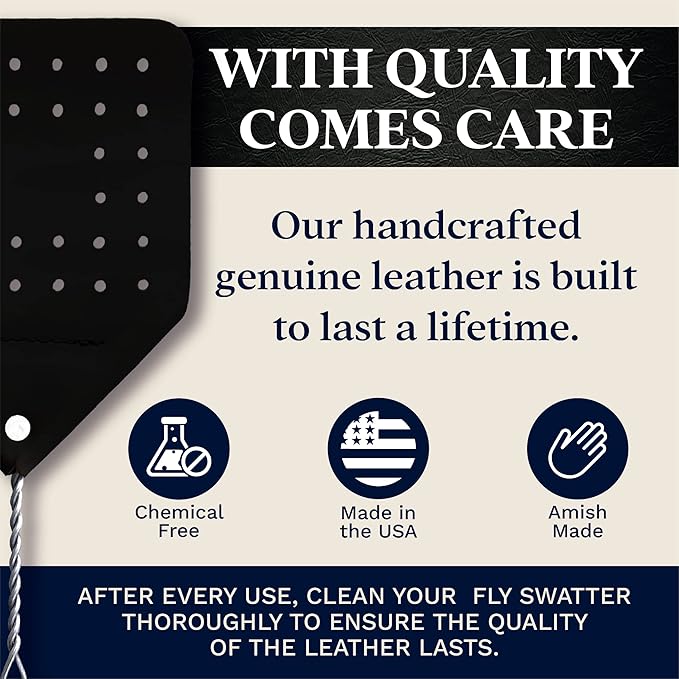 - Heavy-Duty Leather Paddle: This durable large fly swatter is handmade by Amish artisans using premium leather. The giant fly swatter also has a thick leather handle cover that’s bound to the spring-steel handle with a brass rivet. Our Amish big fly swatter will stand up to the biggest bugs and produce a powerful swat.