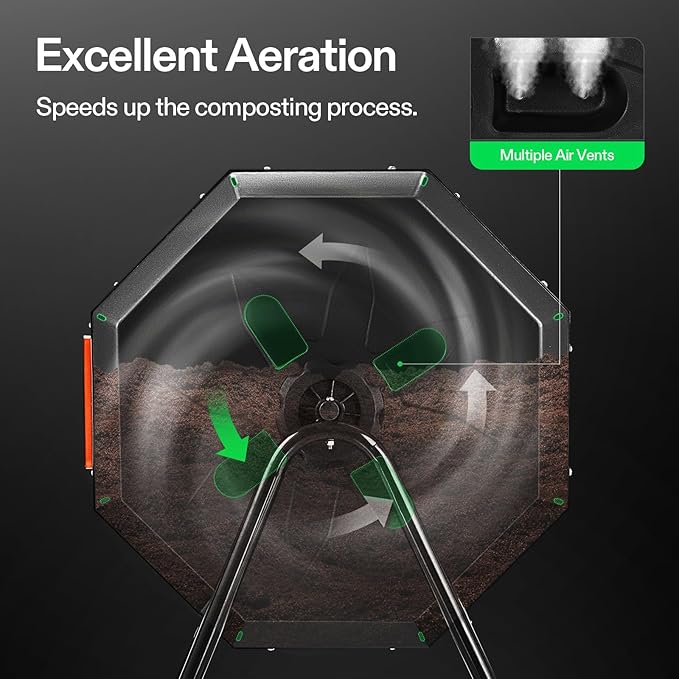 - 360β° Tumbling Design: The rotating design prevents you from digging or mixing the pile by hand; And the deep fins on eight panels make it easier to turn the compost bin
