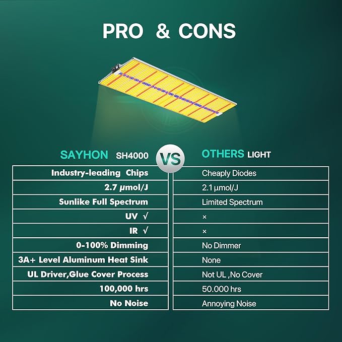 - ๐ฟ Ideal Cooling System: Full coverage 3A+ level aluminum heat sink can lower temperatures 50ยฐF greater than other brands, Sayhon led grow light maintain brightness at 95%+ after 3 years of use.