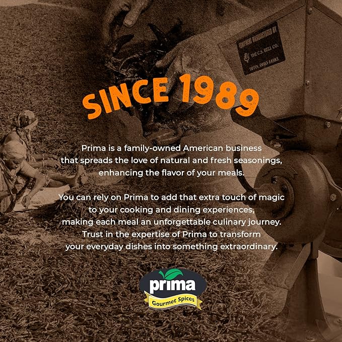 - YOUR SATISFACTION IS MONEY BACK GUARANTEED: Since 1989, Prima Spice has been devoted to sourcing and equipping your kitchens with excellent quality spices that will completely transform your culinary journey. With over 30 years of experience in the seasoning world and an Ironclad 30-Day Money Back Satisfaction Guarantee, you have every good reason to trust Prima Spice for your spice cabinet!