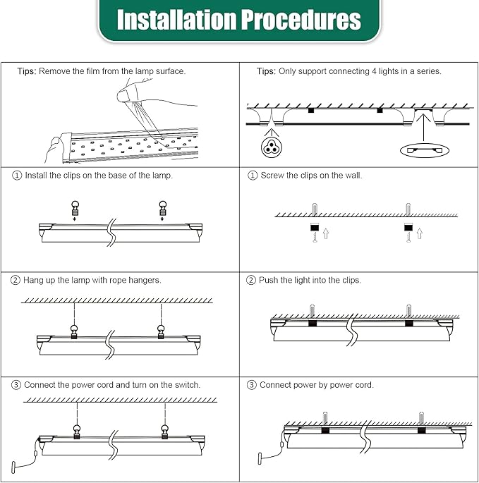 - [Easy to Install] - Plug and play, you could link up to 4 lights in a series by included 47 inches connecting cords or small connector. Using clips to mount on ceiling, using cable ties to tie on grow light stand, or using hanging rope to hang the lights, multiple installation methods provide the best way that you need. Note:The driver of our lights do not support use with a dimmer switch.