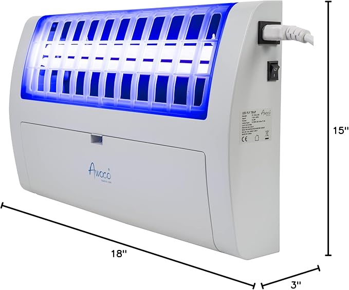 - [1 Year USA Limited Warranty on Fly Trap] - LED UV bulb is consumable depending on power condition which is a 3 months warranty. If the lightbulb fails within 3 months, contact us for a free LED UV bulb replacement limited to USA only. Awoco has UV bulbs and glue boards available. Lamp Overall Dimensions: 18-3/4"W x 3-1/8"D x 11-1/8"H. Type E Glue Board Dimensions: 15-1/4" x 10-5/8".