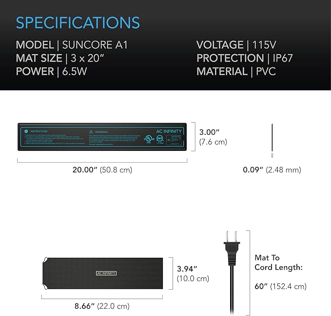 AC Infinity SUNCORE A1, Waterproof Seedling Heat Mat 3" x 20" MET & UL-Certified Heating Pad for Indoor Gardening, Hydroponics, Germination, Cloning