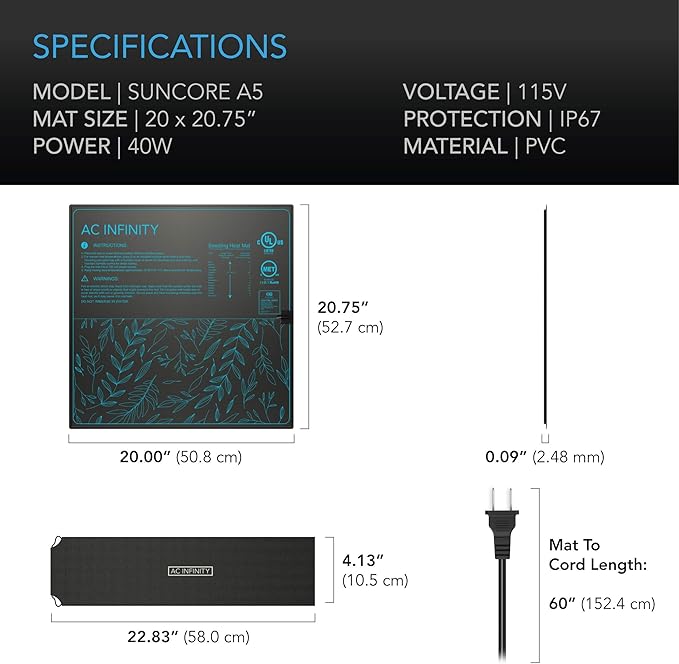 AC Infinity SUNCORE A5, Waterproof Seedling Heat Mat 20" x 20.75" MET & UL-Certified Heating Pad for Indoor Gardening, Hydroponics, Germination, Cloning