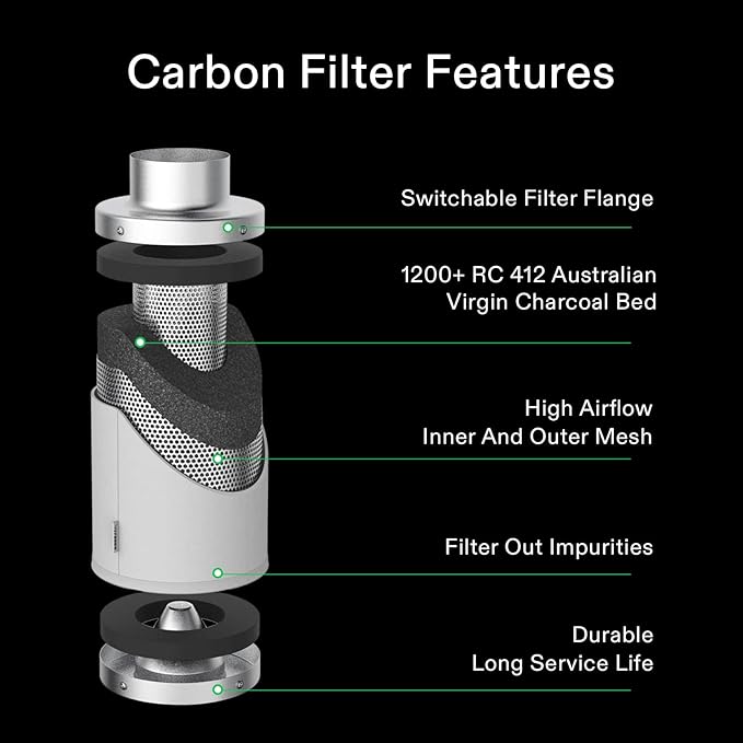 - Effective Ventilation: Heavy hitting blower with a fan speed of 2500 RPM; Puts out only 49 dB noise level; Moves air through your target location efficiently for optimal ventilation; 1050+ RC 48 Australian virgin charcoal bed; The air aluminum ducting featured with the flexible length for exhaust fan blower or inline fan
