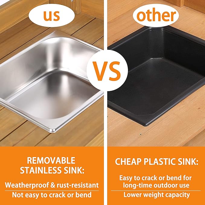 - 【PRACTICAL AND FUNCTIONAL】This garden bench is functional and easy to use with spacious storage shelves, large tabletop with removable stainless sink, extra shelf above the table for placing small tools or flower pots, one drawer and three stainless hooks on the one side of the bench for hanging tools such as small shovels. This potting bench is really an easy piece to assemble.