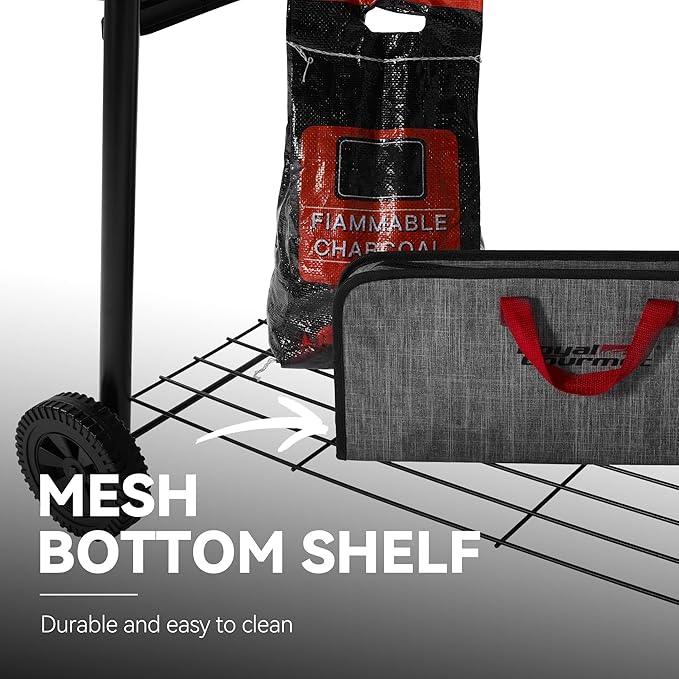 - Ample Space: Front and side tables offer workspace for seasonings and grilling tools. The bottom shelf provides extra storage space and holds up to only 20 lb. accessories when they are evenly distributed.