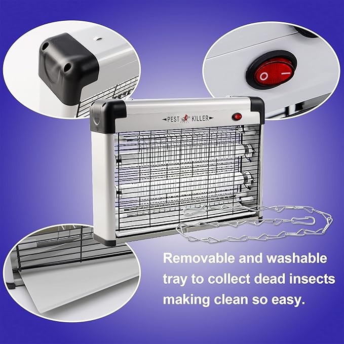 - EASY TO CLEAN: At the bottom of the zapper, there is a removable and washable tray to collect dead insects making clean so easy. The high voltage mental grid can be cleaned with suitable brush. Please unplug the zapper before cleaning.
