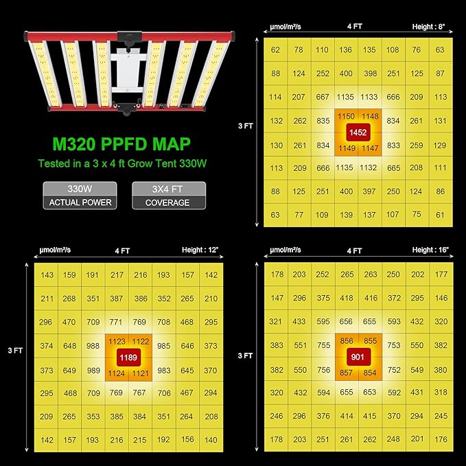 - MAXIMIZE YIELDS & CROP QUALITY - AGLEX M320 led plant growing light is with 1170PCS high efficient chips, only consumes 320w with 1170 leds, achieving higher average PPFD with 1189 µmol/㎡/s at 3x4ft core coverage. The average yield is more than 2.5g per wattage. The 320w led bar grow light can help you achieve maximum quality and quantity. Wide Input Voltage 100-277V, can meet most input voltage.