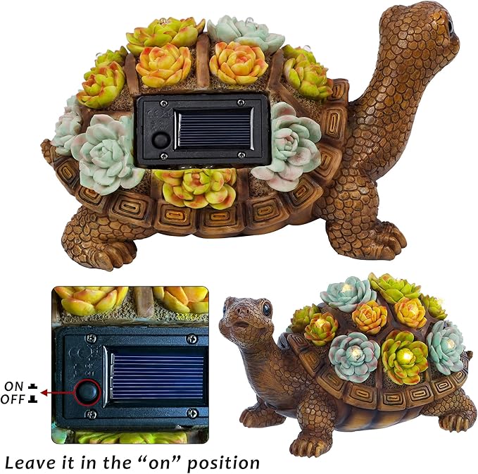 - Solar Turtle Statue: This turtle garden figurines are easy to use, simply turn on the power button before first use, leave it in the on position in the daytime, keep the solar panel under the sun to ensure sufficient sunlight, it will charge during the daylight hours and automatically light up at night for 8-10 hours.