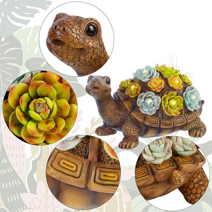 - Turtle Garden Decor: This turtle resin statue is hand-painted with very nice details and good workmanship, designed with succulents of 3 different colors, the center of the flower is decorated with warm white LED lights, emit a warm glow at night, add more charm to your outdoor garden decor.