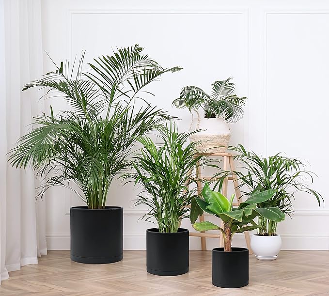 D'vine Dev 8 Inch 10 Inch 12 Inch, Set of 3 Plastic Planter Pots for Plants with Drainage Hole and Seamless Saucers, Black Color, X-Large, 74-V-B-5