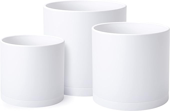D'vine Dev 8 Inch 10 Inch 12 Inch, Set of 3 Plastic Planter Pots for Plants with Drainage Hole and Seamless Saucers, White Color, X-Large, 74-V-A-5