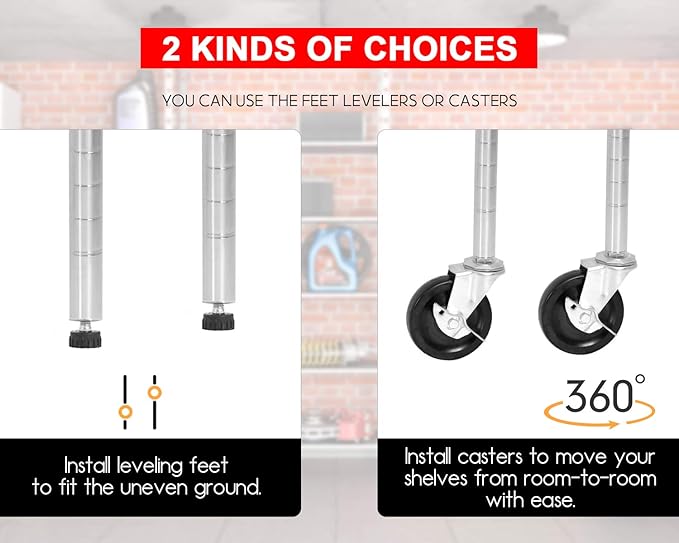 - ✔【Strong Weight Capacity】Without wheels, the weight limit for each shelf is 1000 pounds and the total weight limit for the entire shelf is 6000 pounds.When wheels are mounted, the weight limit for each shelf is 100 pounds and the total weight limit for the entire shelf is 600 pounds.