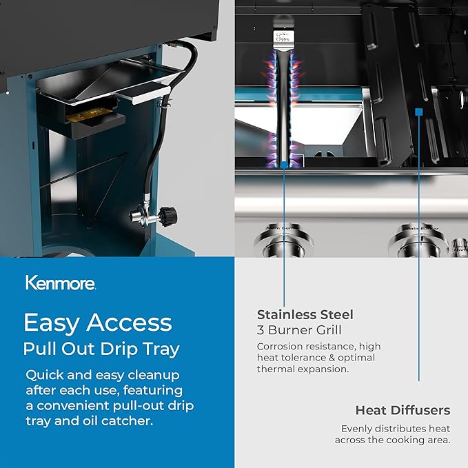 - 4 CASTER WHEELS FOR EASY MOBILITY β Who needs muscles when you've got wheels? The Kenmore 3-Burner Gas Grill comes equipped with 4 smooth-rolling wheels, 2 of which lock for added security and stability. No heavy lifting required! Take this grill on the go and lock it into place wherever you desire. Whether you're grilling up a storm on your backyard patio or taking it on the road to your next tailgate, this grill's got your back.