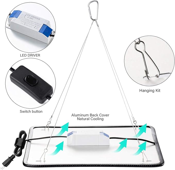- SMALL AND HANDY AND FLEXIBLE GROW LIGHT- High performance aluminum substrate provides efficient heat dissipation. Fan free plant lamp has lighter weight and no excess noise. The weight is only 450g, which is suitable for greenhouse tents and gardening enthusiasts at home. You can freely place it in any suitable position.