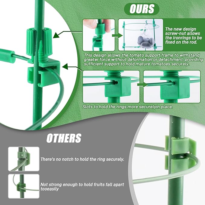 - 【Adjustable Design】 Our tomato cage features a unique nut-lock system, allowing height adjustment of support rods and diameter customization of rings (7.8-11 inches) to accommodate plants through all growth stages.