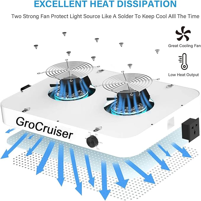 - Adjustable Brightness: Full spectrum led grow light adjustable dimming from 0-100%. You can set brightness plant light at 30%-50% for seed starting or seedlings, 60%-80% for growing, 90%-100% for flowering. Can carry you through all stages of growth. (Fans and work along with the dimming knob. When lowering brightness, it also reduces the fan speeds as well.)
