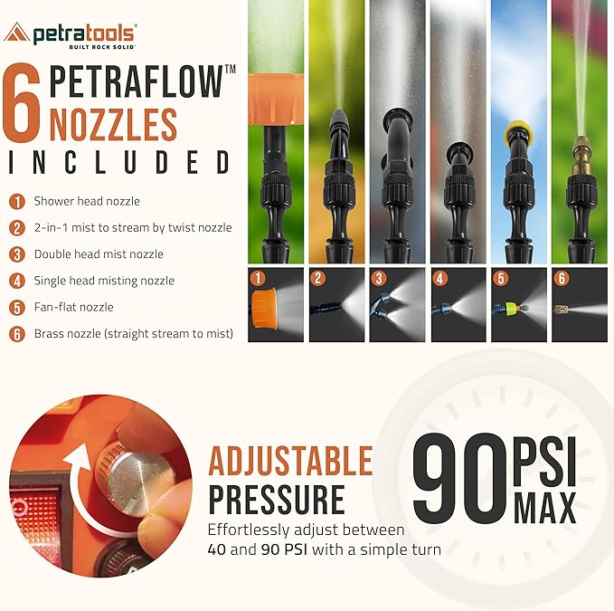 - 6 DIFFERENT NOZZLES INCLUDED: PetraTools wants to meet your spraying need for every situation! Get 6 different PetraFlow nozzles included - a shower head nozzle, 2-in-1 mist to stream, double head mist nozzle, single head mist, fan-flat nozzle and brass nozzle (straight to mist). Also includes a Heavy Duty wand and plastic squeeze handle with locking mechanism.