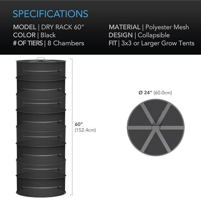 - 8 Tiers | 24 in. Diameter | Fits 3x3 or Larger Grow Tents | Includes Hanging Hook & Carrying Bag