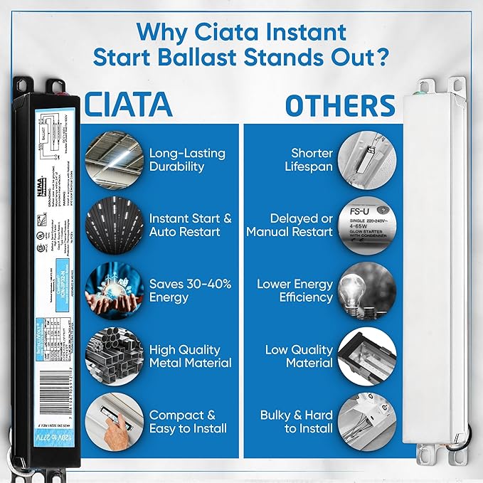 - PREMIUM QUALITY: The Ciata Instant Start Centium Electronic Fluorescent Ballast Housing Material is made of high-quality Metal that ensures lifetime durability and high quality for the product. The product meets strict high-quality requirements to be safe and reliable and is approved for Indoor/Outdoor location use. The Electronic Ballast is suitable for Outdoor area use.