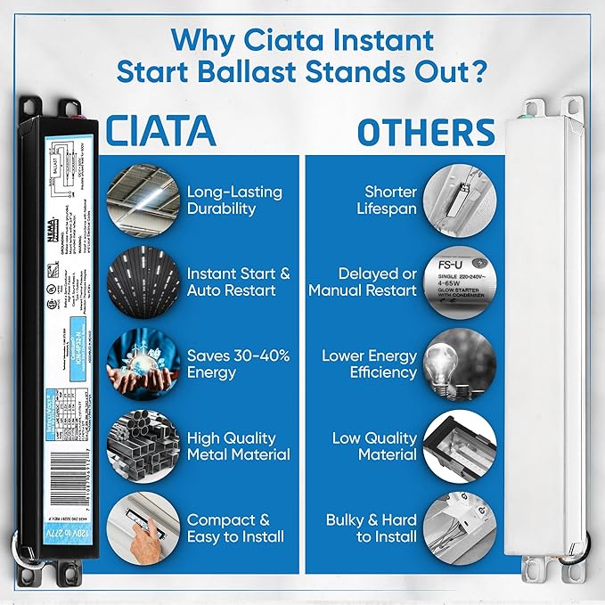 - PREMIUM QUALITY: The Ciata Instant Start Centium Electronic Fluorescent Ballast Housing Material is made of high-quality Metal that ensures lifetime durability and high quality for the product. The product meets strict high-quality requirements to be safe and reliable and is approved for Indoor/Outdoor location use. The Electronic Ballast is suitable for Outdoor area use.
