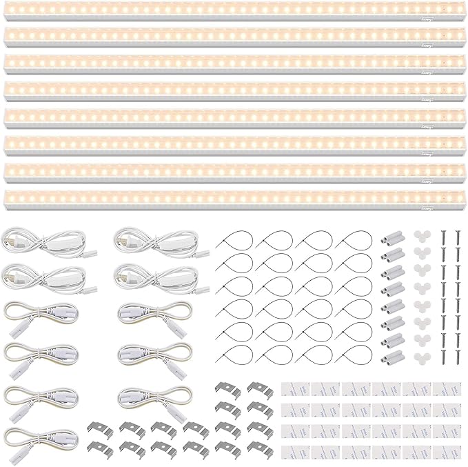 - What You Get - 8 x Barrina T5 Grow Lights, 4 x Power Cords with ON/OFF Switch, 7 x Connecting Cords(20''), 8 x Small Connectors, 16 x Installation Clips, 24 x Double-sided Tapes, 24 x Cable Ties