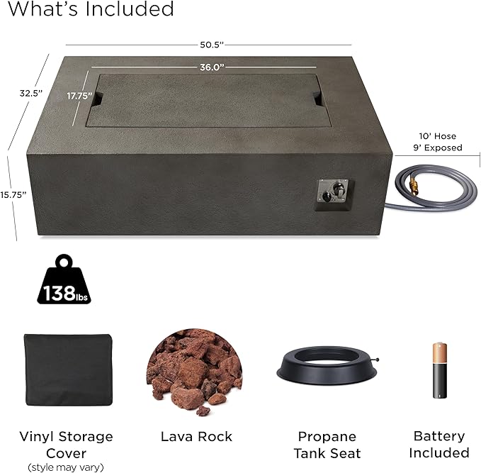 - Includes fire table with leveling feet, 28.5" linear stainless steel burner, matching burner lid, lava rock filler, vinyl storage cover, hose guide and 10' NG hose with quick connect socket