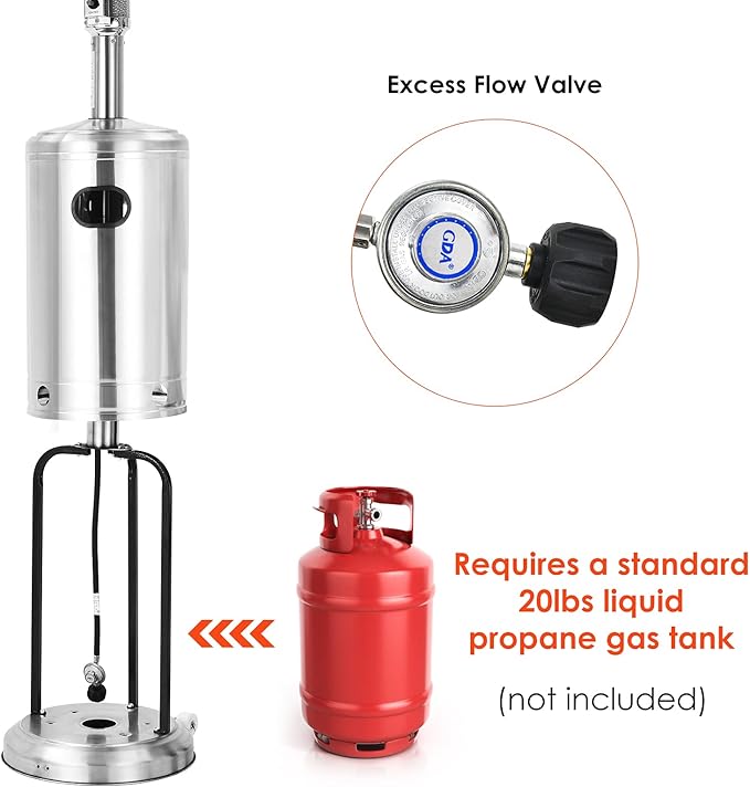 - Patio Heater with Efficient & Fast Heating: Made of premium steel, this patio propane heater with powder-coated surface is rustproof and durable enough to stand the test of bad weather. The patio heater with a 32'' reflector provides a spacious warm area of up to 15 ft in diameter, and powerful 48000 BTU of heat ensures faster heating speed.