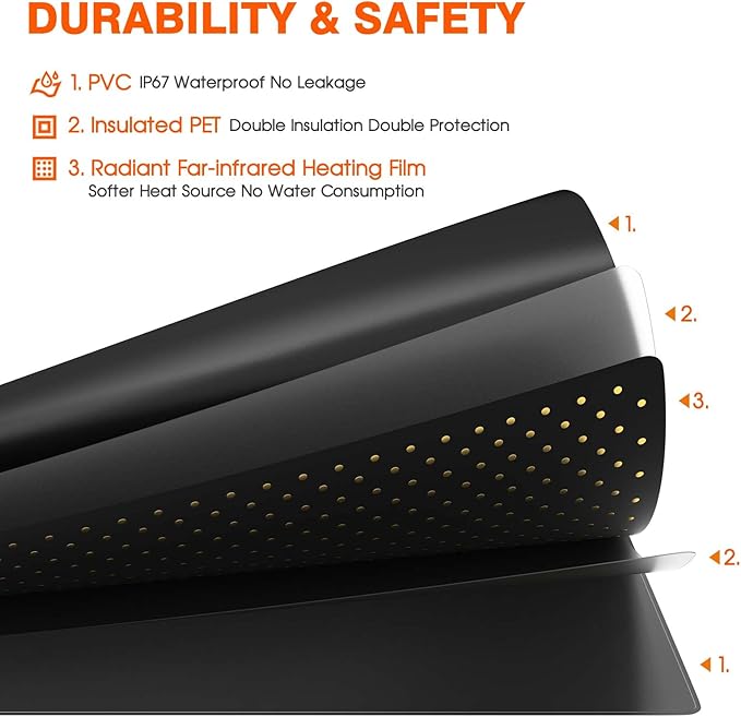 - [PREMIUM MATERIAL & RELIABLE QUALITY]: The plant heating pad has a five-layer structure, the outer layer is made of heavy-duty PVC material, and the intermediate heating film is wrapped in a double-layer insulating PET layer, which complies with MET and UL standards, and has multiple protections. It is not easy to be damaged, safer to use, sturdy and durable, with a service life of more than 30,000 hours.