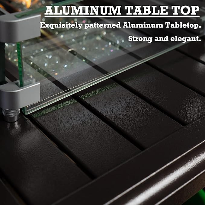 - ✅Aluminum Tabletop & Glass Wind Guard - The fire pit table features an aluminum tabletop and a glass wind guard for added safety and convenience.