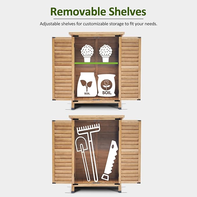- Small Wood Shed: The small size tool shed allows you to place it in more places, such as outdoor, indoor, garden, yard, porch and even more. (Dimension: 24.6" x 18.3" x 38.2")