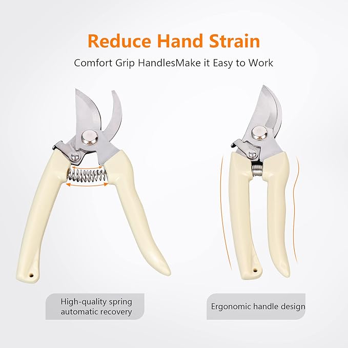 - Garden scissors adopt an ergonomically designed curved grip, which can reduce the pressure on your hands. With the way the spring is designed, this one stays loose, so it is very quick, and you can keep moving.