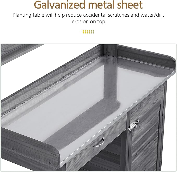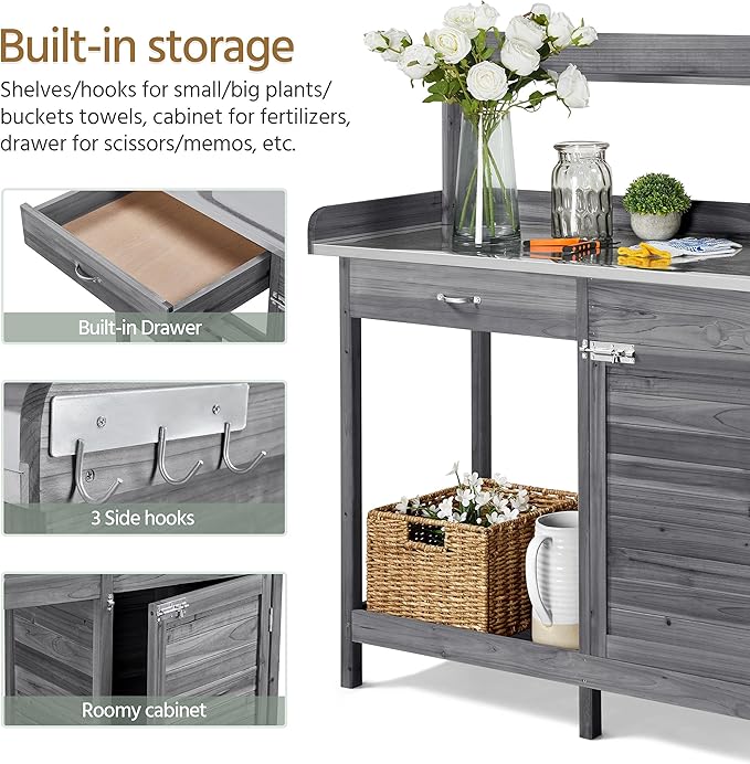 Yaheetech Outdoor Potting Bench Table, Garden Workstation w/Metal Tabletop/Cabinet Drawer/Open Top/Lower Shelf/Handy Hooks for Horticulture,Gray