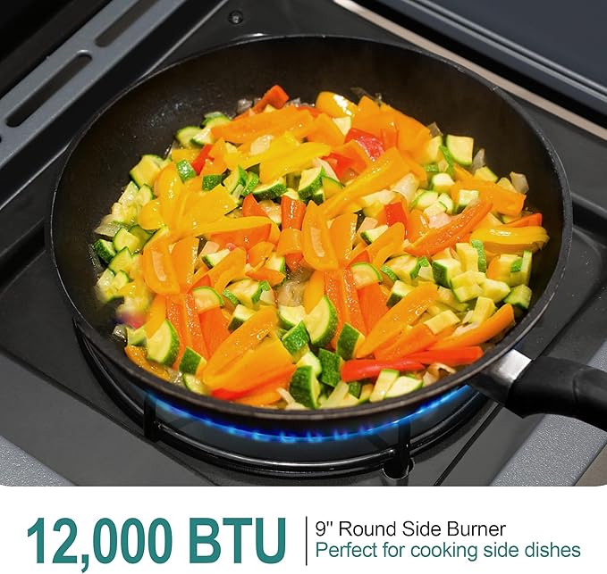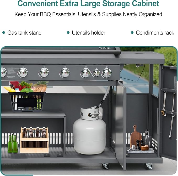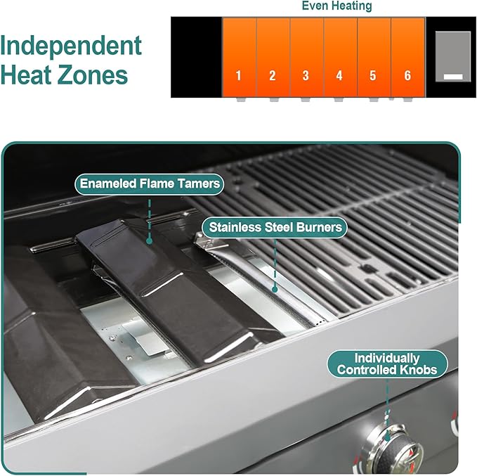 - 【Powerful Gas Grill with Side Burner】6 stainless steel burners (10,000 BTU each) and a 12,000 BTU side burner deliver 72,000 BTU of even heat for versatile outdoor cooking—perfect for your outdoor kitchen grill setup
