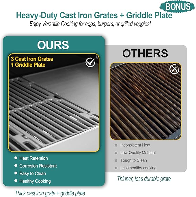 - 【Complete Outdoor BBQ Kitchen Island】Includes two cast iron grates and a griddle plate for pancakes, stir-fry, or other dishes, transforming your backyard into a fully functional outdoor bbq island