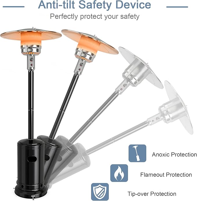 - Multiple Safety Protection: To better protect usersโ safety, we carefully design the deck heater with anti-tilt safety device and ground fixer. Thus, you donโt need to worry about it suddenly tipping over. Besides, the Flame-out Protection system automatically shuts off the gas supply when the flame goes out. And CSA certification ensures high security.