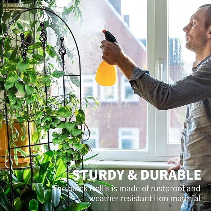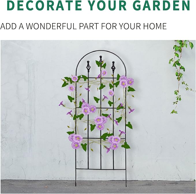 - [Sturdy Stability Structure]: With heavy duty iron frame and powder coated welded material. 6 inch ground spike inserts into the ground and add stability to the trellises.